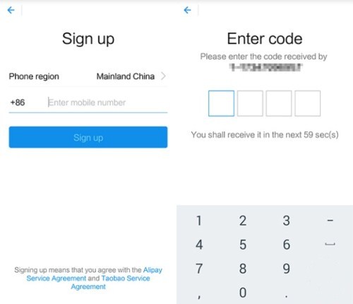 First, get the latest version of the app from the app store. Sign up with a valid mobile phone number. Alipay will send a text message with a confirmation code to the number, which you will have to input. Set a password on the next screen and the app will log you in automatically.