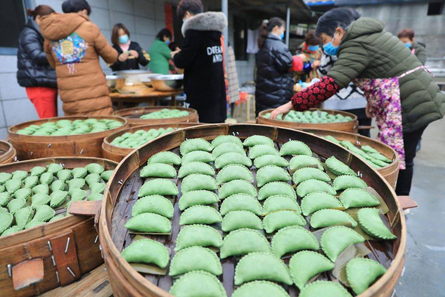 Villagers in Hangzhou, Zhejiang province are making local specialty food "Qingming rice cake", for Tomb-sweeping Day. Qingming rice cake is steamed with glutinous rice flour mixed with wormwood or sage juice. [Photo/Facebook account: Zhejiang, China]