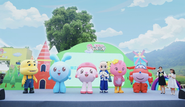 Cartoon characters pose for photos in Jingshan town. [Photo/WeChat account: jingshanhuahai]