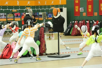 Children practice fencing during the Huanglong Fitness Day at the Huanglong Sports Center on Aug 7. [Photo/Hangzhou Daily]