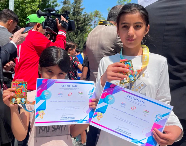 Before the fun run started, the National Olympic Committee of Tajikistan announced the 10 winners of the Asian Games children's art competition, which was held on April 14. The best four art works have the chance to be put on display at the 19th Asian Games in Hangzhou from Sept 23 to Oct 8.
