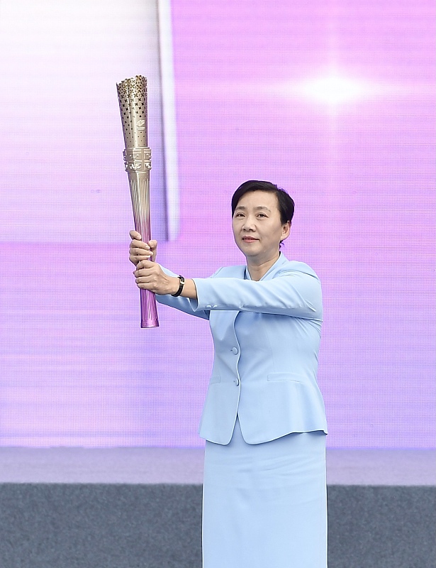 Named "Laurels," the design of the torch was inspired by the ancient jade "Cong" unearthed from the Archaeological Ruins of Liangzhu City and features the symbolic flower of Hangzhou - the osmanthus.