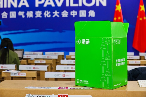 Cainiao, Alibaba's logistics arm, displays a green recycling box at COP19. The box is equipped with radio frequency identification technology chips for digital management. [Photo/tidenews.com.cn]