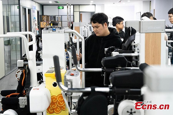A technician checks robotic exoskeleton in Hangzhou City, Zhejiang Province, March 13, 2025. (China News Service/Wu Junyi)
